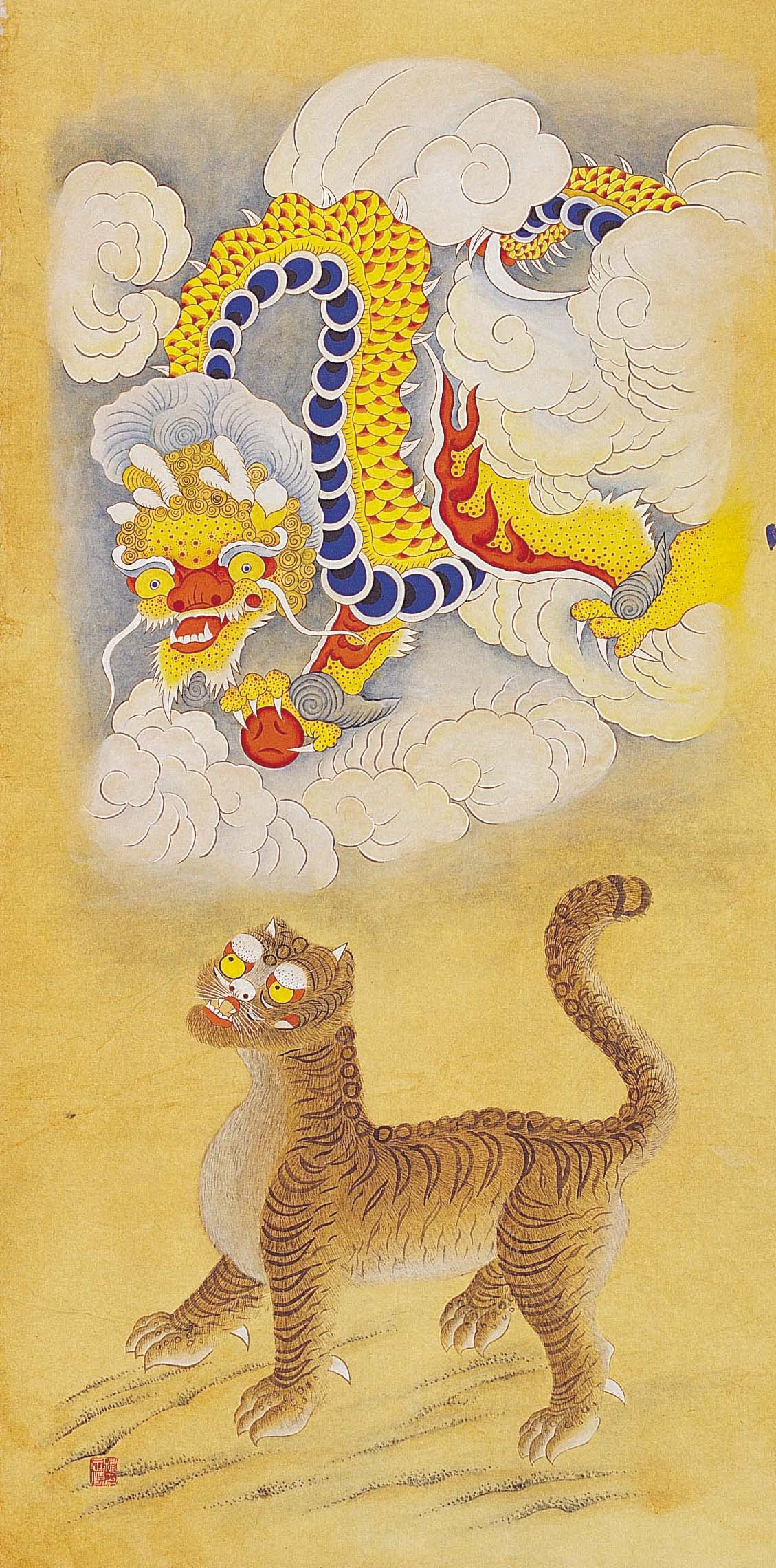 ¿¾³¯ »ç´ëºÎ Áý¿¡¼´Â ´ë¹®¿¡ ¿ë°ú È£¶ûÀÌ ±×¸²À» ºÙ¿´´Ù. È£¶ûÀÌ´Â ±Í½ÅÀ» ÂÑ°í ¿ëÀº º¹À» ²ø¾î µéÀδٴ ¶æÀ¸·Î ¸¸µé¾îÁø ¹®¹è ±×¸²À̶ó ÇϰڴÙ.